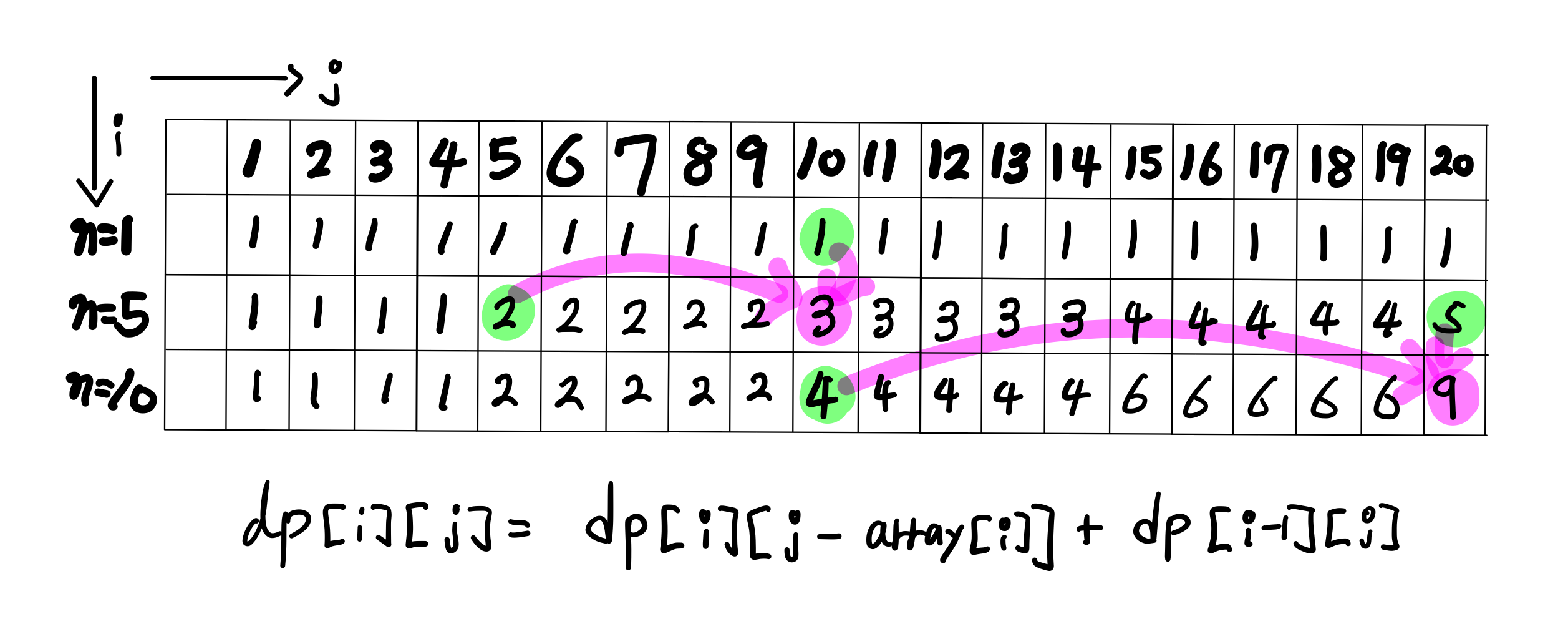 dp[i][j] = dp[i][j-array[i]] + dp[i-1][j];