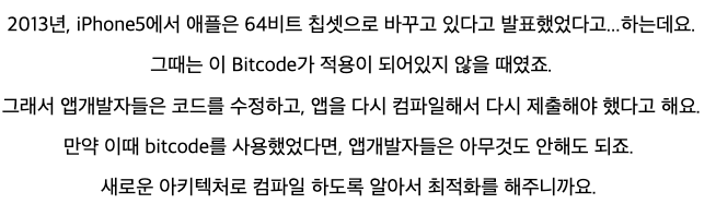 애플은 업로드된 비트 코드를 통해서 개발자의 새로운 버전의 앱 업로드 없이도 앱 바이너리를 최적화할 수 있다고 한다.