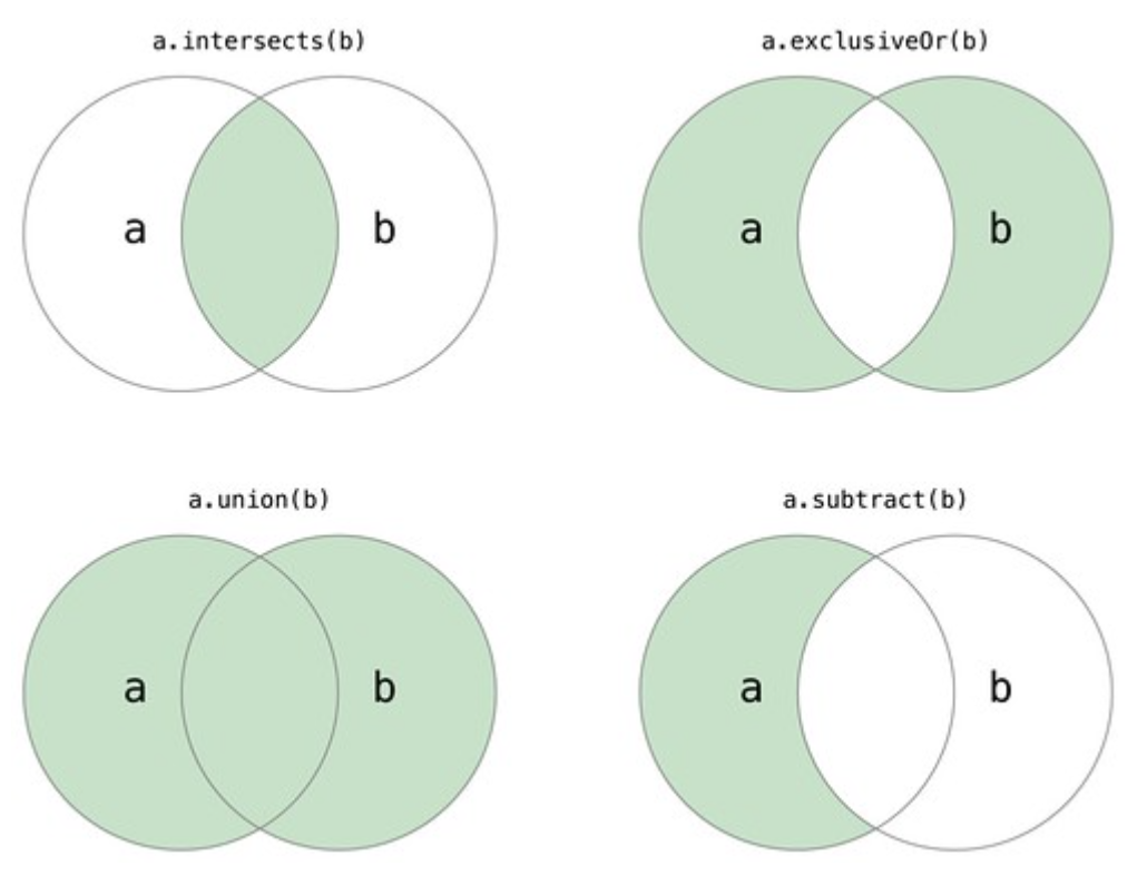 | exclusiveOr | 교집합을 제외한 나머지 부분을 새로운 Set으로 생성 |