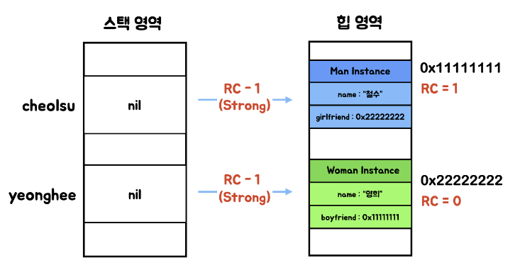 저 상태에서 cheolsu와 yeonghee의 값을 nil로 변경하면 힙 영역 내부의 인스턴스의 RC값은 1씩 줄어들게 되는데 0이 아닌 1이 되므로 영구적으로 메모리 속에 남아 있게 된다.