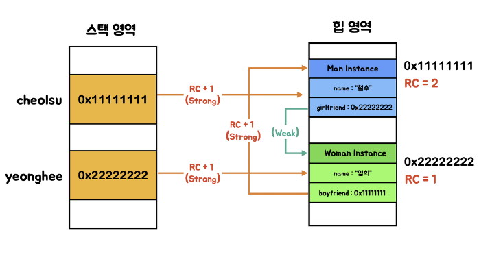 다음과 같이 Woman에서 Man은 강한 참조를 하지만 Man에서 Woman은 약한 참조를 해서 Woman의 RC이 증가하지 않는다.