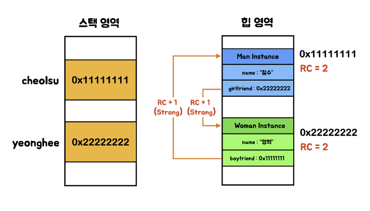 힙 영역에서 RC값이 서로 참조가 되어 2가 되었다.