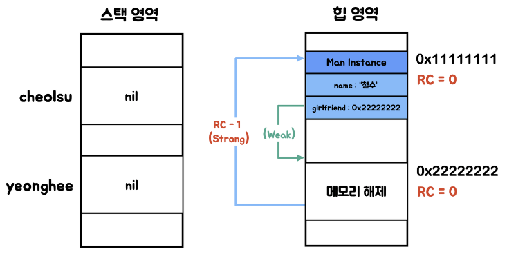 그 이후 Woman 인스턴스가 해제되고 Man의 RC값은 0이 되므로 메모리에서 해제된다.