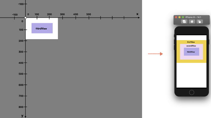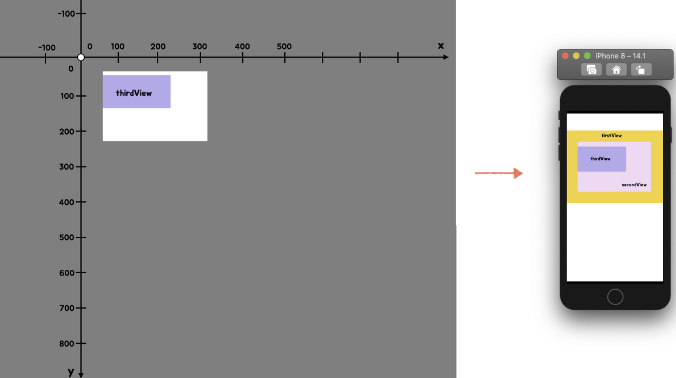 secondView의 frame origin 좌표를 변경하는 경우 thirdView도 같이 움직이는 이유는 frame의 좌표는 SuperView(thirdView의 Superview는 SecondView!)의 좌표를 기준이다.
